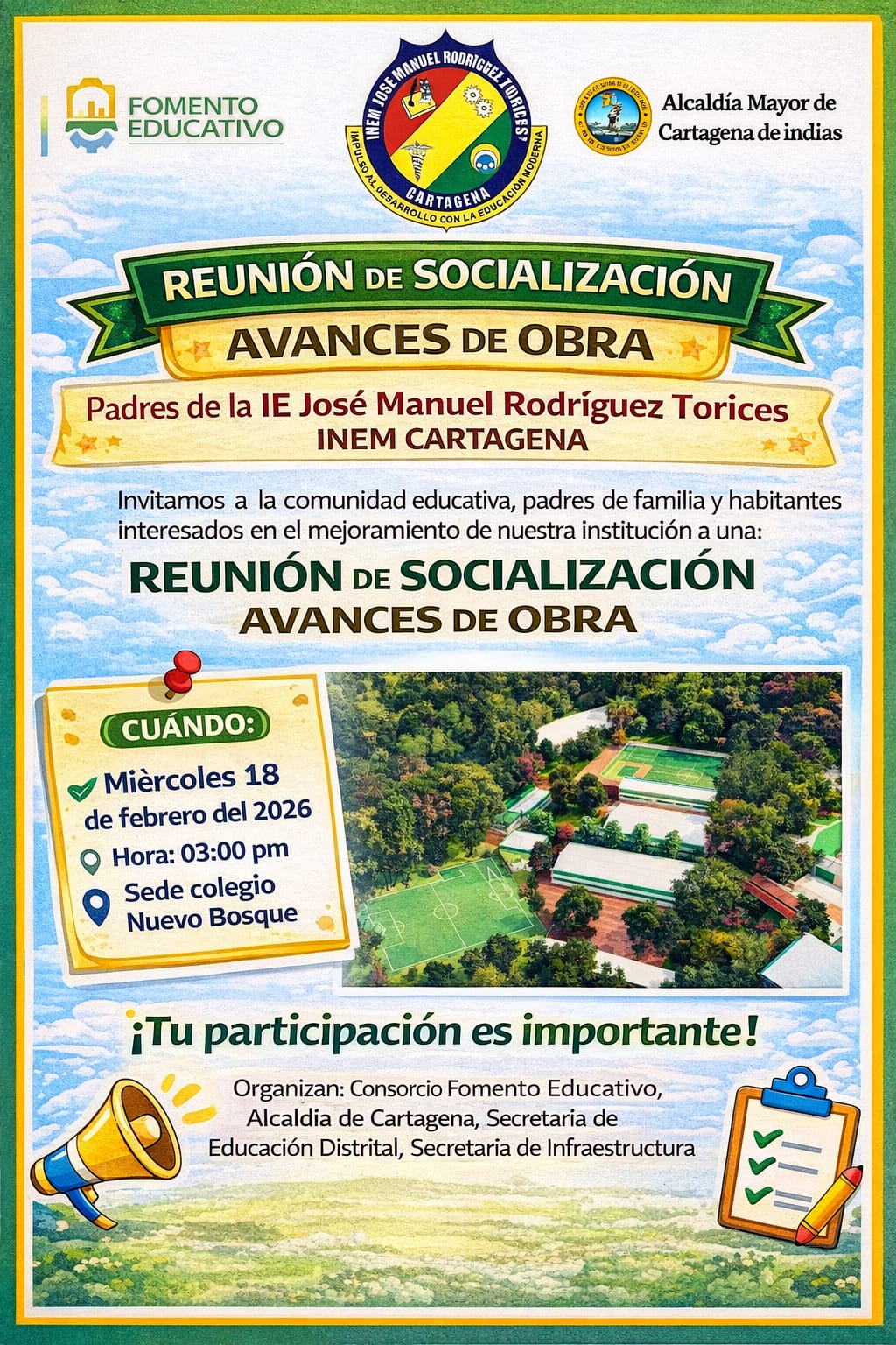 La Institución Educativa José Manuel Rodríguez Torices – INEM Cartagena invita a padres de familia, acudientes y habitantes del sector a la Reunión de Socialización de los Avances de Obra que se adelantan en la institución.