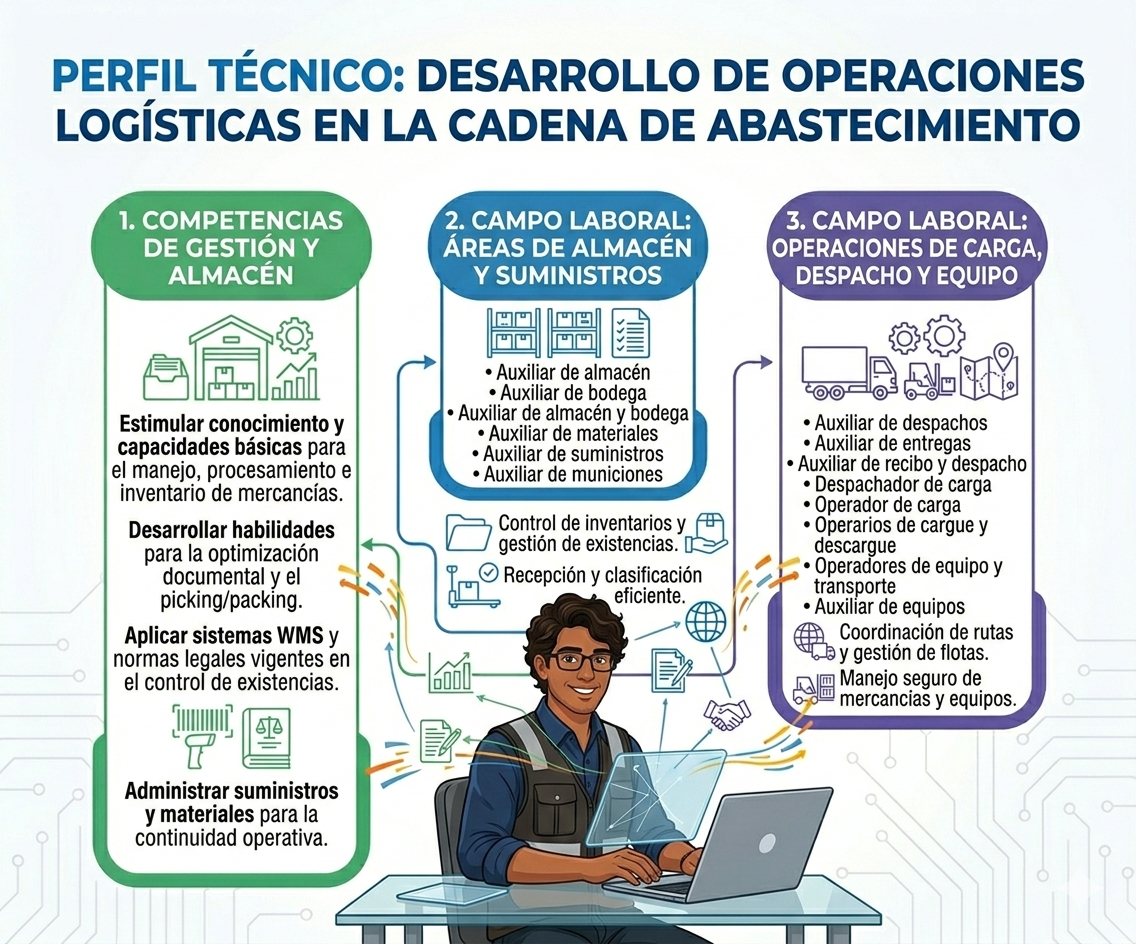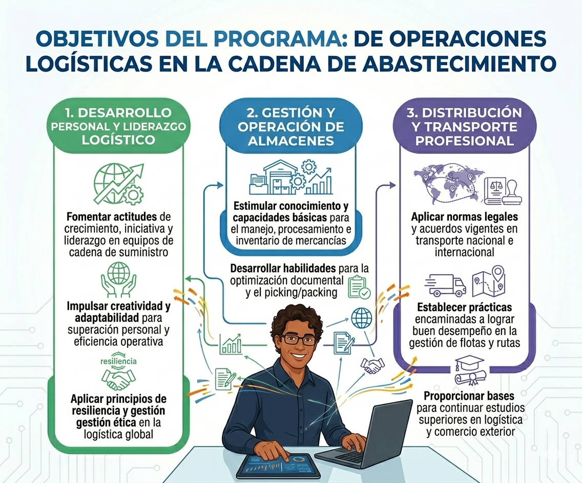El Programa de formación para el Técnico En Desarrollo De Operaciones Logísticas En La Cadena De Abastecimiento; se creó con el propósito de formar operarios en logística, con amplio dominio técnico, investigativo y humanístico, garantizando una formación de calidad frente a los diferentes procesos logísticos requeridos por las empresas de acuerdo con la estructura del sector productivo y el nivel ocupacional y de esta manera contribuir a la transformación del contexto social y el mundo laboral en los diferentes sectores económicos del país.