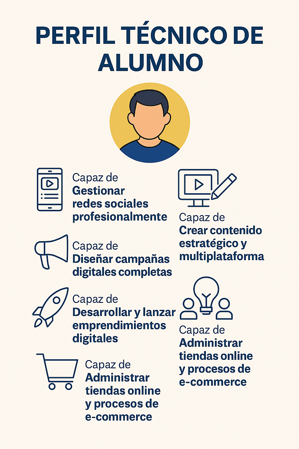 Formar estudiantes capaces de diseñar, ejecutar y optimizar estrategias de marketing digital y comunicación en redes sociales, integrando conocimientos de creación de contenido, análisis de datos, comercio electrónico, emprendimiento digital y gestión de comunidades, para fortalecer la presencia digital de marcas, proyectos y emprendimientos.