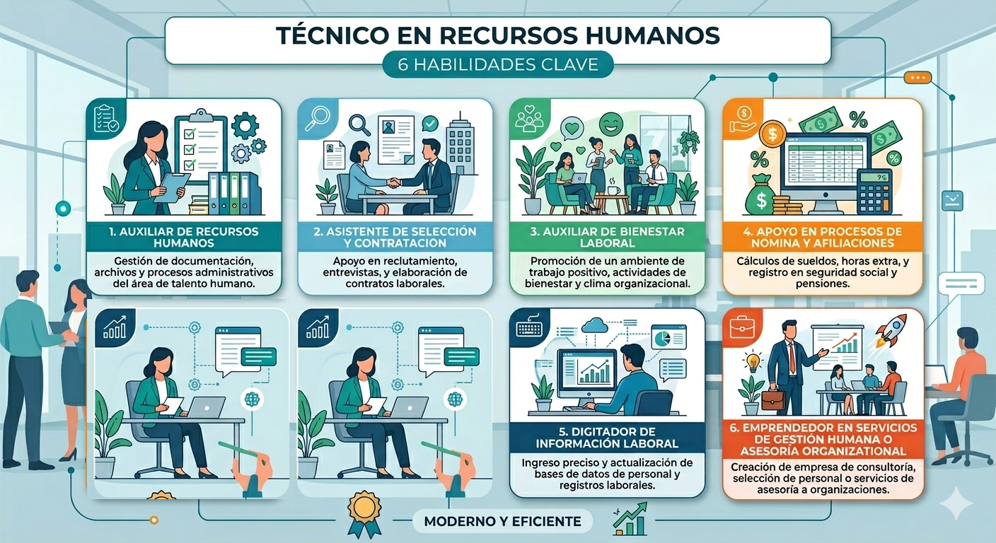 La carrera Técnica en Recursos Humanos está orientada a formar estudiantes con competencias prácticas y humanas para apoyar los procesos de gestión del talento en organizaciones públicas y privadas.