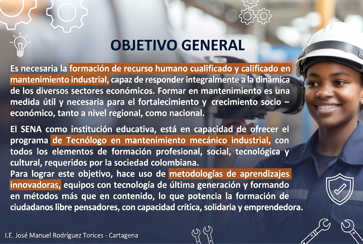 El programa de técnico mecánico en mantenimiento de maquinaria industrial, se creó para brindar a las empresas locales y colombianas, la posibilidad de incorporar personal con competencia en operación, gestión y control del mantenimiento con altas calidades laborales y profesionales que contribuyan al desarrollo económico, social y tecnológico de su entorno y del país.
