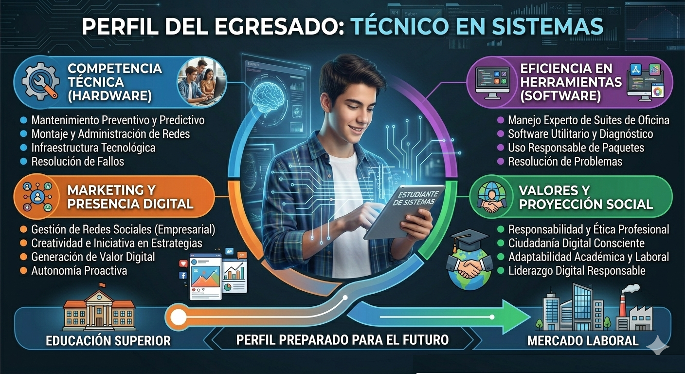 El egresado será un técnico capaz de intervenir equipos y entornos digitales con solvencia, dominando el ensamble y desensamble de hardware, la configuración básica de redes, la administración de redes sociales y el uso de herramientas ofimáticas para proyectos institucionales. Su formación promueve competencias en tecnologías de la información y la comunicación, integrando el conocimiento técnico con los contextos reales donde se desarrolla la actividad humana, para formar personas competentes, actualizadas y capaces de responder adecuadamente a los retos de las nuevas tecnologías.